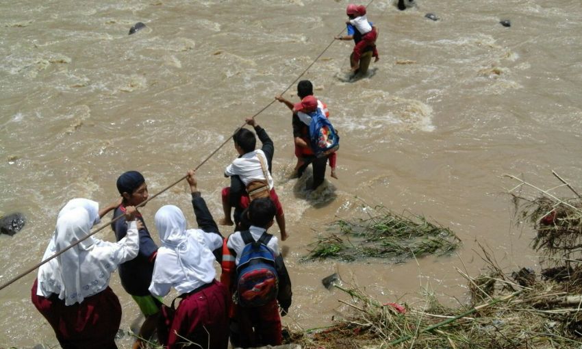 Tekad mereka terhalang arus deras sungai yang membuat mereka terpaksa harus bergelantungan di tali sling ketika berangkat sekolah akibat putusnya jembatan gantung di tempat mereka. Beruntung sejumlah relawan Palang Merah Indonesia (PMI) memberikan bantuan sebagai 'jembatan hidup' .